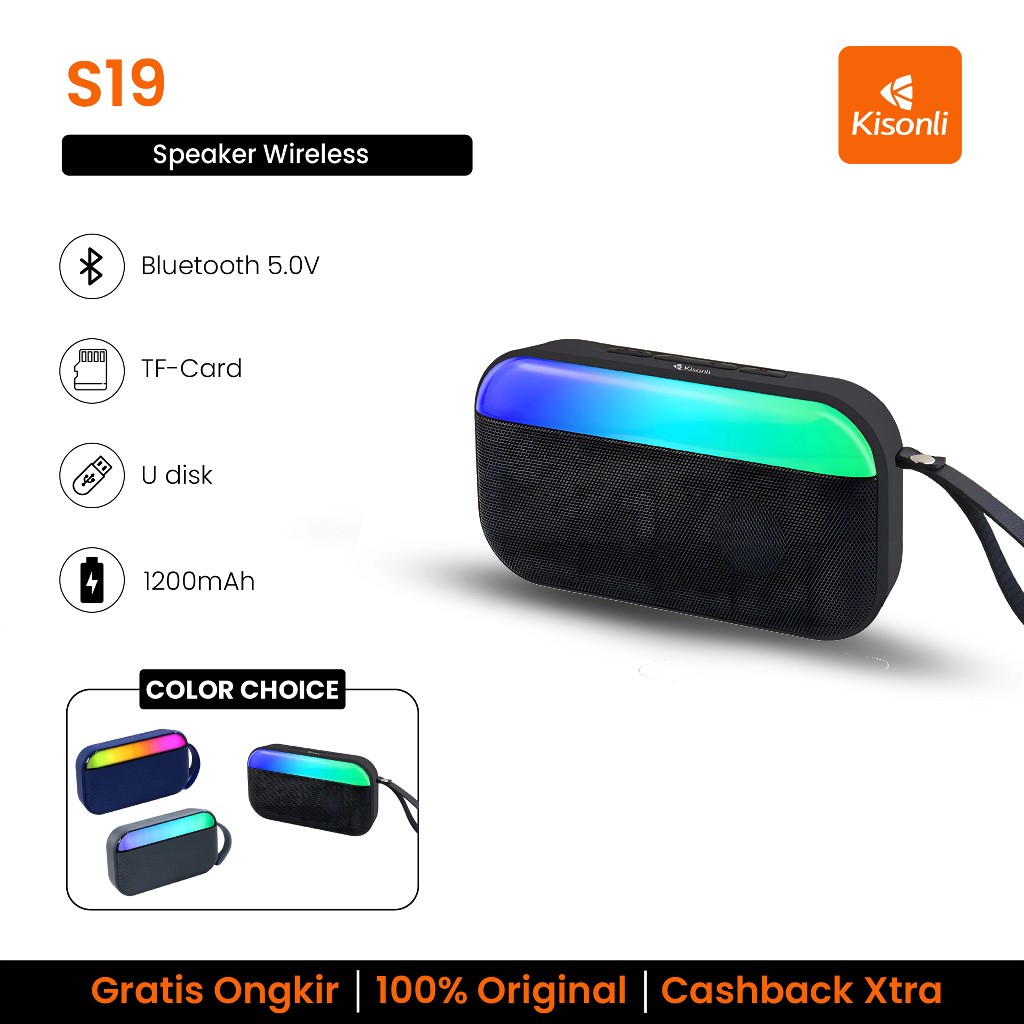 Kisonli S19 is a portable Bluetooth speaker with a 5W output, a 1200mAh battery, and various connectivity options.
