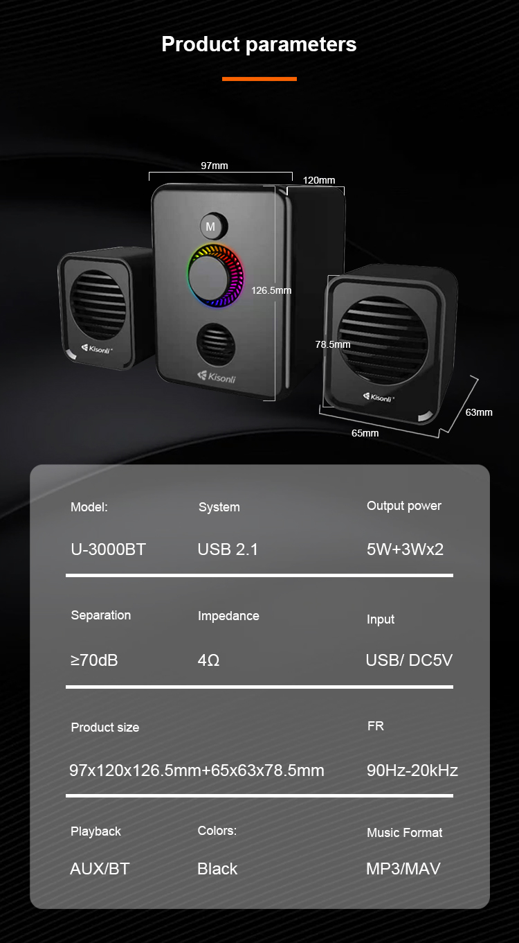 The KISONLI U-3000BT Bluetooth Speaker 2.1 Channel is a multimedia Bluetooth speaker system, designed for computer use. It features a main speaker and two satellite speakers, offering a combination of wired and wireless connectivity options.