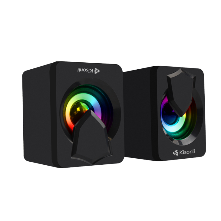Speaker KISONLI L1030 BLACK is of 2 Pieces 2*2.5W, wired, RGB, 2.0 multimedia computer speaker system. It connects via USB for power and a 3.5mm audio jack for audio input.