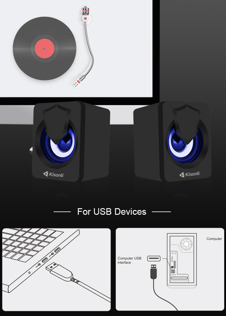 The KISONLI SPEAKER V310 is a compact, wired 2.0 multimedia computer speaker system