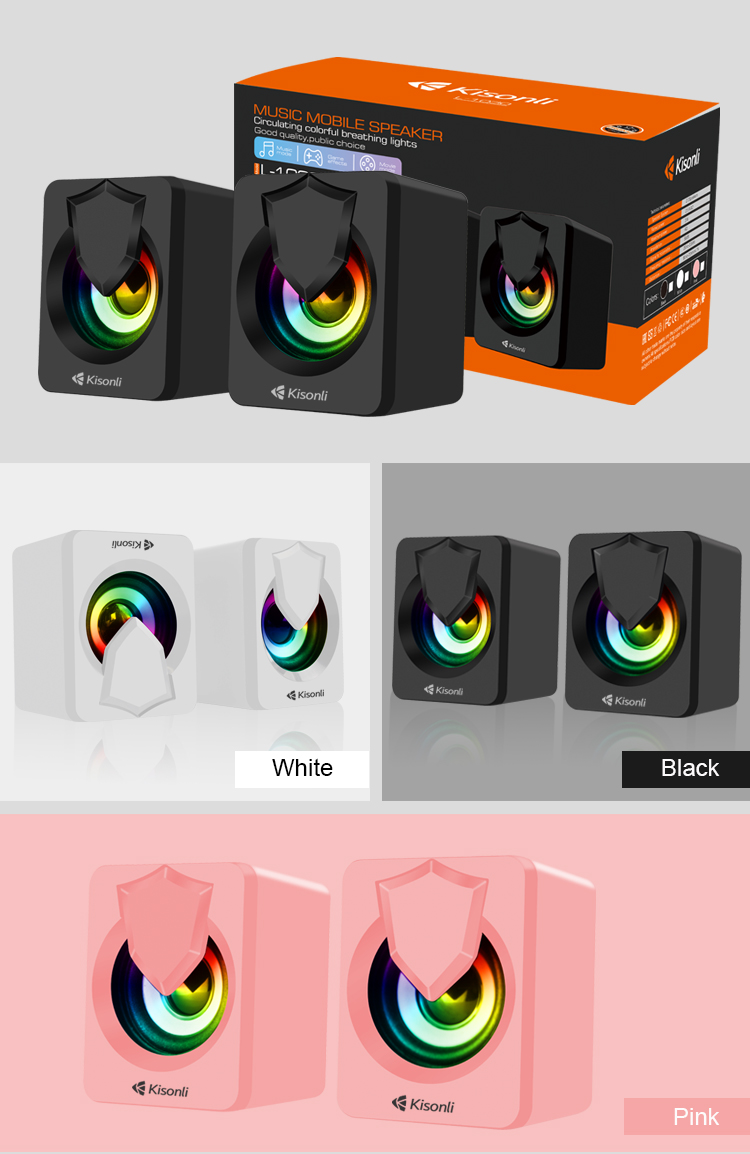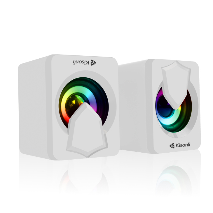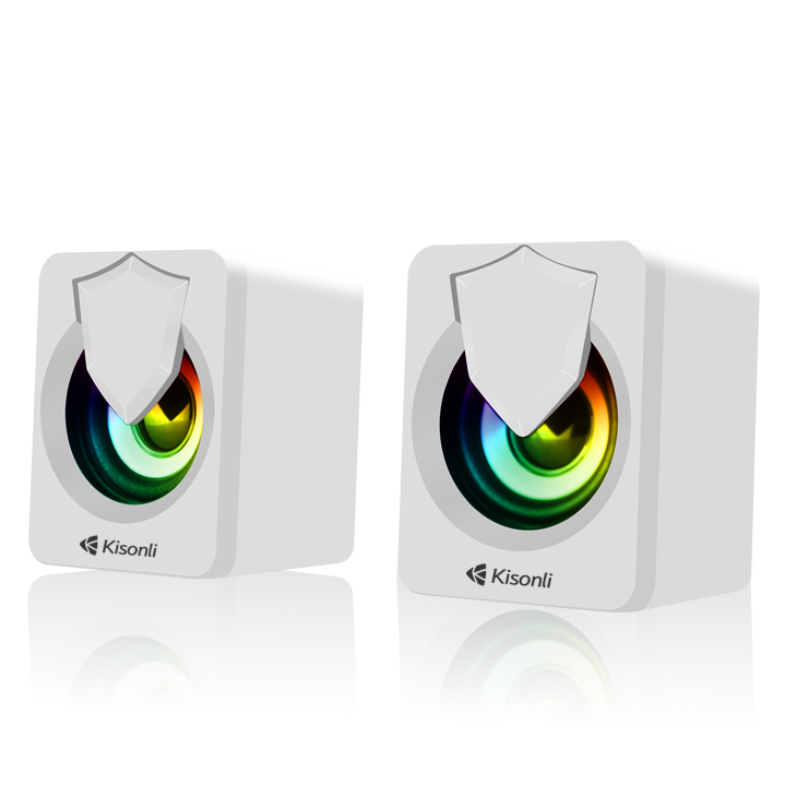Speaker KISONLI L1030 WHITE is of 2 Pieces 2*2.5W, wired, RGB, 2.0 multimedia computer speaker system. It connects via USB for power and a 3.5mm audio jack for audio input.